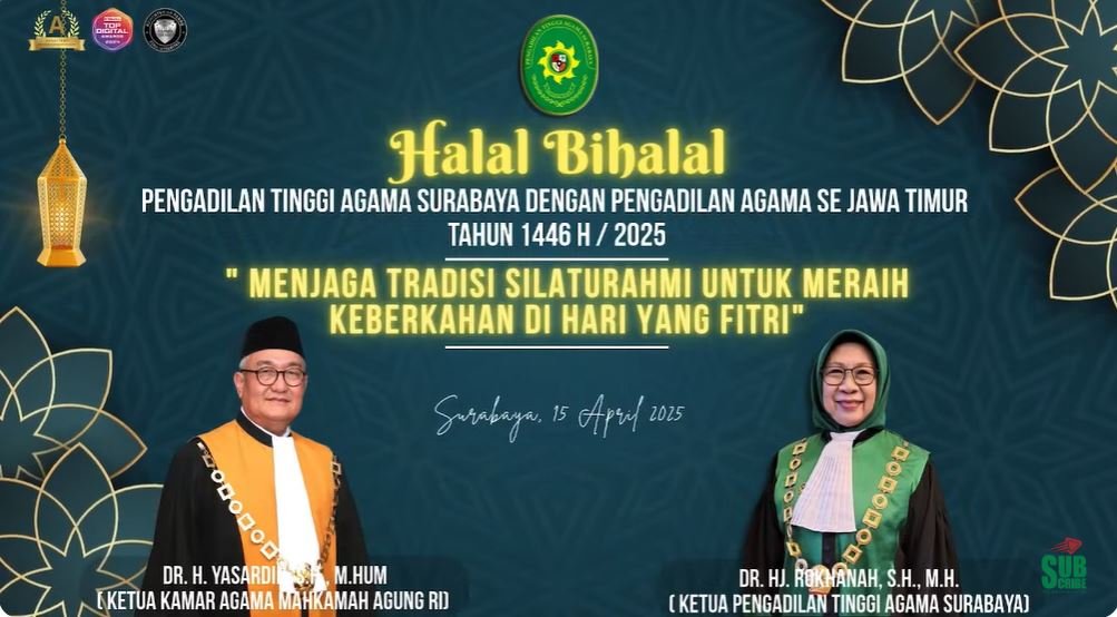 Pada selasa (15/4) Ketua PA Ngawi Mohammad Anton Dwi Putra, S.H., M.H. beserta Panitera Tamaji, S.Ag., M.H dan Sekretaris Sutji Eny Lestari, S.H menghadiri halal Bi Halal berdasarkan surat undangan nomor 1476/KPTA.W13-A/UND.HM3.1.3/III/2025 tanggal 24 Maret 2025 tentang pelaksanaan kegiatan pembinaan dan halal bi halal di Pengadilan Tinggi Agama Surabaya Jl. Mayjen Sungkono No.7 Surabaya. Acara dimulai pukul 09.00 WIB dan dihadiri oleh Ketua PTA Surabaya Dr. Hj. Rokhanah, S.H., M.H., Wakil Ketua Drs. H. Rusman Mallapi, S.H., M.H. segenap Hakim Tinggi, Panitera, Sekretaris PTA Surabaya serta Ketua bersama Panitera dan Sekretaris Pengadilan Agama se- Jawa Timur. Pada acara halal bi halal ini turut serta pula Ketua dan anggota Dharmayukti Karini PTA Surabaya. Kegiatan halal bi halal Pengadilan Agama di Lingkungan Pengadilan Tinggi Agama (PTA) Surabaya 1446 H mengusung tema “Menjaga Tradisi Silaturahmi untuk Meraih Keberkahan di Hari yang Fitri” dan dapat disaksikan secara live streaming pada kanal Youtube PTA Surabaya.
