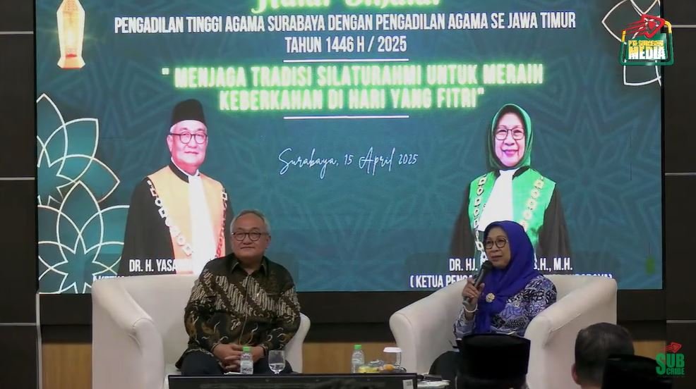 Ibu KPTA Surabaya juga menyampaikan permohonan maaf lahir dan batin baik secara pribadi maupun kedinasan pada giat hari ini atas segala kesalahan dan kehilafan baik yang sengaja maupun tidak sengaja selama di PTA Surabaya dan Pengadilan Agama yang berada di wilayah PTA Surabaya. Dengan adanya halal bi halal ini, beliau senantiasa berharap kedepannya selalu menjadi ajang silaturahmi dan menjaga komunikasi sesama dan semoga kita semua termasuk orang diterima semua amal ibadah serta Allah SWT memberikan umur Panjang sehingga kita semua dapat bertemu Ramadhan dan Idul Fitri yang akan datang. Aamiin” Pada kesempatan ini pula Ibu KPTA Surabaya turut mengucapkan terimakasih kepada seluruh satker di lingkungan PTA Surabaya yang telah mengikuti kegiatan semarak Ramadhan dan Idul Fitri tahun 2025 yang tertuang dalam Lomba Ramadhan Peduli dengan tema “Ramadhan Saatnya Peduli Untuk Berbagi” dengan kategori lomba kultum Ramadhan, ucapan selamat Idul fitri, dan lomba nasyid atau religi.