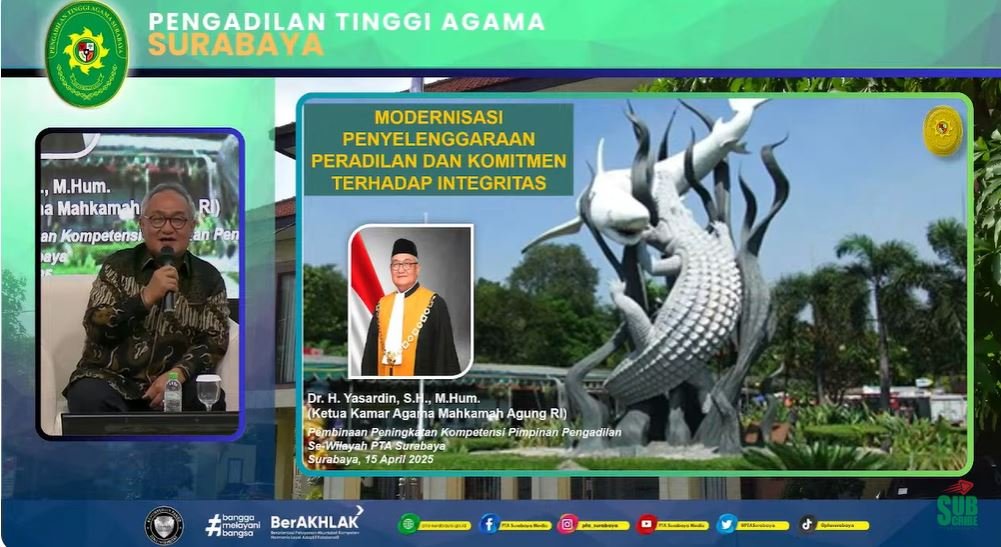 Acara dilanjutkan dengan launching buku “Pengadilan Tinggi Agama Surabaya dari Zaman Kolonial sampai Zaman Milenial”. Buku ini merupakan karya anak bangsa yang berada di wilayah PTA Surabaya. Buku ini dilaunching secara langsung oleh Ketua Kamar Agama Mahkamah Agung RI YM. Dr. H. Yasardin, S.H., M.Hum. Dengan adanya launching buku ini dapat menjadi wadah generasi penerus dalam melanjutkan para pejuang dalam mewujudkan peradilan agama yang agung. Kegiatan dilanjutkan dengan pengumuman pemenang lomba Ramadhan Peduli Pengadilan Tinggi Agama Surabaya serta pembinaan oleh Ketua Kamar Agama Mahkamah Agung RI. Dalam pembinaannya, Ketua Kamar Agama MA RI YM. Dr. H. Yasardin, S.H., M.Hum menyampaikan tentang Modernisasi Penyelenggaraan Peradilan dan Komitmen Terhadap Integritas yang mempunyai korelasi modernisasi Penyelenggaraan Peradilan dengan Visi dan Misi Mahkamah Agung RI. Modernisasi penyelenggaraan peradilan merupakan implementasi nyata visi Mahkamah Agung untuk mewujudkan Badan Peradilan Yang Agung dan Misi Mahkamah Agung yaitu Meningkatkan Kredibilitas dan transparansi Badan Peradilan. Beliau juga memaparkan dengan adanya pemanfaatan IT di pengadilan secara akuntabel aparatur pengadilan dapat terjada dari perilaku koruptif, kinerja aparatur pengadilan dipertanggungjawabkan kepada publik, pengadilan terdorong untuk meningkatkan kualitas kerja. Kemudian secara transparan dapat membuat informasi status penanganan perkara terbuka bagi publik, untuk mendapatkan informasi perkara tidak perlu mendatangi Gedung pengadilan, kinerja pengadilan dapat diketahui publik, dan terbuka untuk saling terhubung dengan Lembaga penegak hukum yang lain. Adapun secara efektif dan efisien pemanfaatan IT menjadikan otomatisasi administrasi perkara, efisiensi pekerjaan (tidak ada pengulangan), jangka waktu penanganan perkara termonitor, status penanganan perkara diketahui secara real time, kinerja individu terekam otomatis, serta pelaporan tersaji dengan cepat dan akurat.