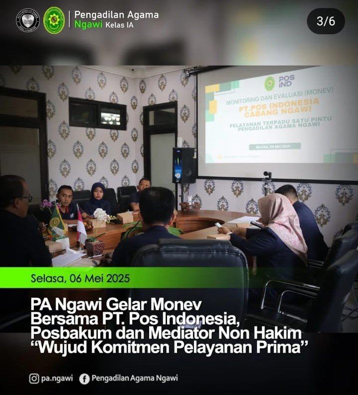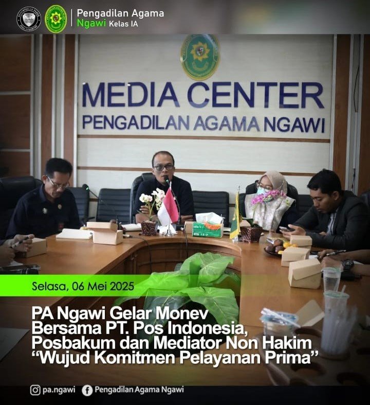 pa.ngawi Ngawi, 06 Mei 2025 - Dalam upaya menjaga mutu dan akuntabilitas pelayanan publik, Pengadilan Agama Ngawi kelas IA menggelar kegiatan Monitoring dan Evaluasi (Monev) terhadap mitra-mitra layanan pelayanan Pengadilan Agama Ngawi yakni PT. Pos Indonesia Cabang Ngawi, Pos Bantuan Hukum (Posbakum), dan Mediator Non Hakim, bertempat di Ruang Media Center PA Ngawi. Kegiatan evaluasi ini dipimpin langsung oleh Ketua Pengadilan Agama Ngawi Mohammad Anton Dwi Putra, S.H., M.H. didampingi Wakil Ketua, Hakim, Panitera, dan Panitera Muda. Dalam forum tersebut, dibahas performa masing-masing mitra yang turut melayani masyarakat secara langsung di area PTSP PA Ngawi dan proses mediasi persidangan.