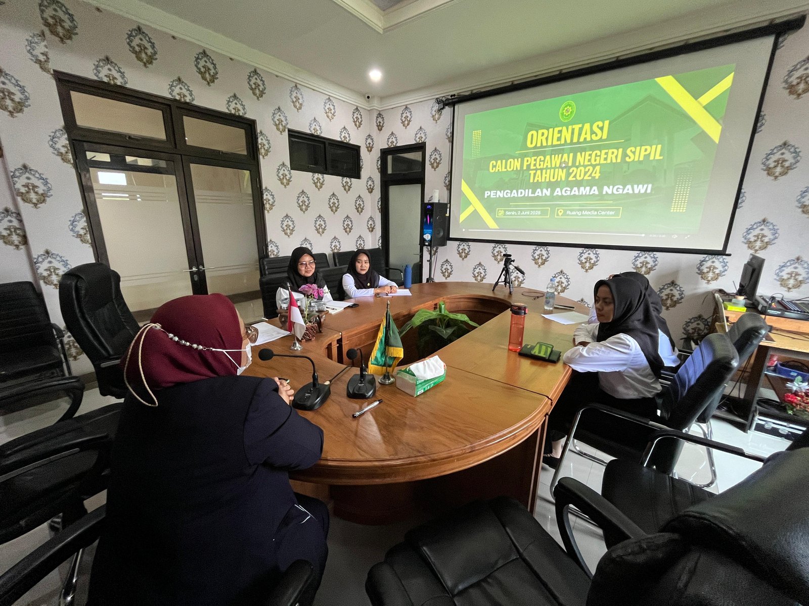 Ngawi, 2 Juni 2025 — Pengadilan Agama Ngawi melaksanakan kegiatan orientasi bagi Calon Pegawai Negeri Sipil (CPNS) yang baru bergabung pada hari Senin, 2 Juni 2025. Dari total 5 orang CPNS yang diterima pada tahun ini, 4 orang telah melapor dan hadir mengikuti kegiatan orientasi yang diselenggarakan di ruang media center Pengadilan Agama Ngawi.