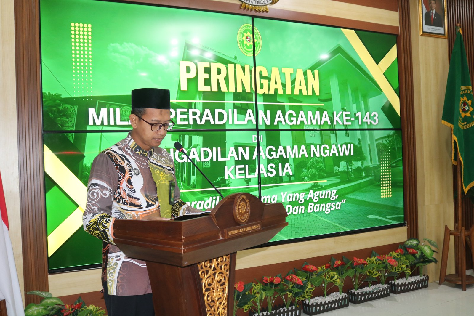 Dalam rangka memperingati milad ini, turut hadir Ketua Pengadilan Agama Ngawi Veni Mustika Endriastuti Triyogi Oktaviani, S.H., M.H., Kepala Kejaksaan Negeri Ngawi Susanto Gani, S.H., M.H. dan Kepala Kantor Kemenag Kab Ngawi Pengadilan Agama Ngawi Dr. H. Moh. Ersat, M.H.I. Acara dimulai pukul 08.30 WIB yang bertempat di ruang multimedia center Pengadilan Agama Ngawi Kelas IA. Dalam menyelenggarakan serangkaian kegiatan ini secara sederhana namun sarat makna, di antaranya doa bersama dan tasyakuran. Acara dibuka dengan pembacaan Kalam Illahi oleh Sdr Alif Syarifuddin dan Doa Khotmil Quran oleh Sdr Abdullah Ahmad, S.H yang merupakan salah satu rangkaian dari Milad Peradilan Agama ke 143 tahun.