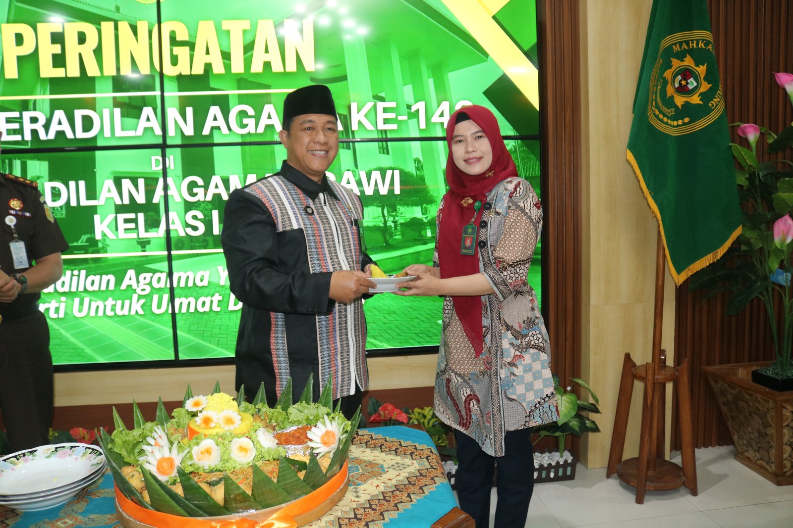 Acara dilanjutkan dengan pemberian cinderamata dan pemotongan tumpeng sebagai bentuk simbolik ucapan rasa syukur dan kebahagiaan dalam peringatan Milad Peradilan Agama ke 143. Selama lebih dari satu abad, Peradilan Agama telah menjadi tempat masyarakat pencari keadilan menyelesaikan perkara-perkara seperti perceraian, waris, hibah, wasiat, wakaf, dan ekonomi syariah. Dengan dukungan digitalisasi seperti SIPP, e-Court, dan layanan berbasis daring lainnya, Peradilan Agama terus bertransformasi menuju lembaga peradilan modern. Dengan semangat milad ke-143 ini, segenap aparatur Peradilan Agama diharapkan terus meningkatkan dedikasi, memperkokoh integritas, serta memperluas akses keadilan yang inklusif dan responsif terhadap kebutuhan masyarakat. Selamat Milad ke-143 Peradilan Agama! Terus Bertransformasi untuk Peradilan yang Agung dan Melayani. (Media PA Ngawi)