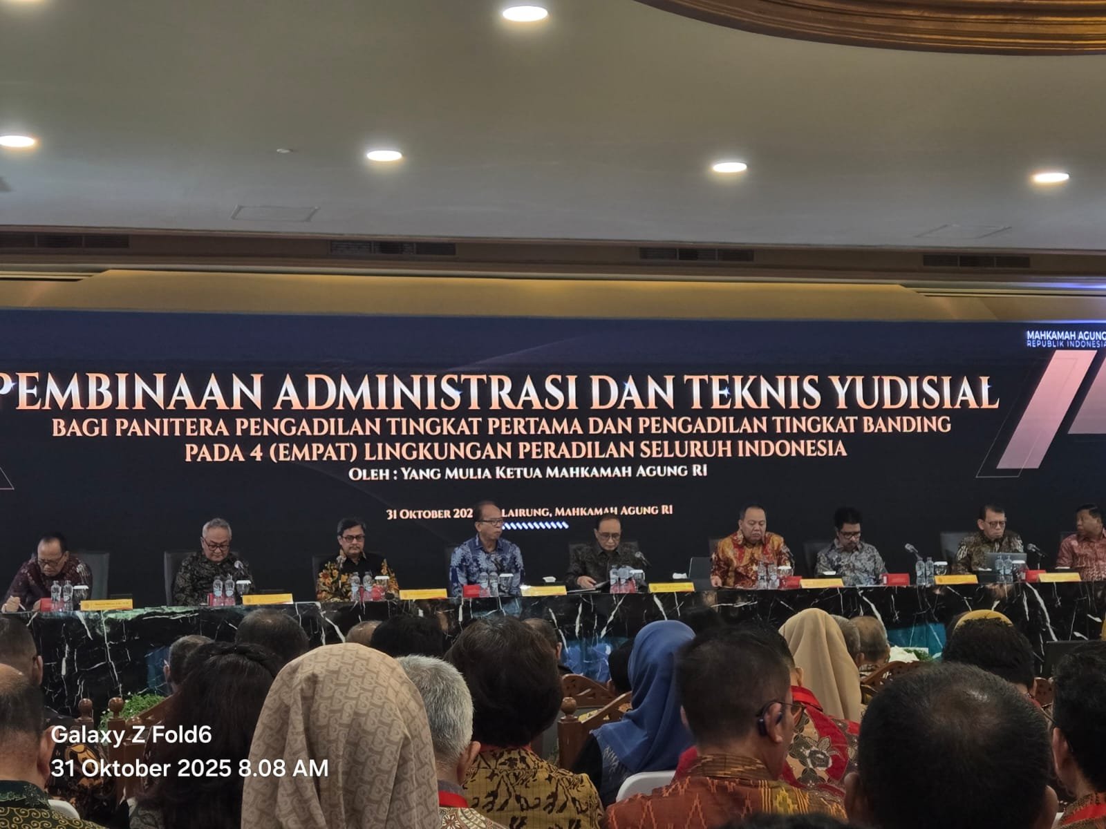 Jakarta, 31 Oktober 2025 - Panitera Pengadilan Agama Ngawi Kelas IA, Tamaji, S.H., menghadiri kegiatan Pembinaan Bidang Teknis dan Administrasi Yudisial yang diselenggarakan oleh Wakil Ketua Mahkamah Agung Republik Indonesia Bidang Yudisial. Kegiatan ini berlangsung di Balairung Lantai 1 Gedung Mahkamah Agung Republik Indonesia, Jakarta, selama tiga hari, mulai Kamis hingga Sabtu, 30 Oktober sampai dengan 1 November 2025.