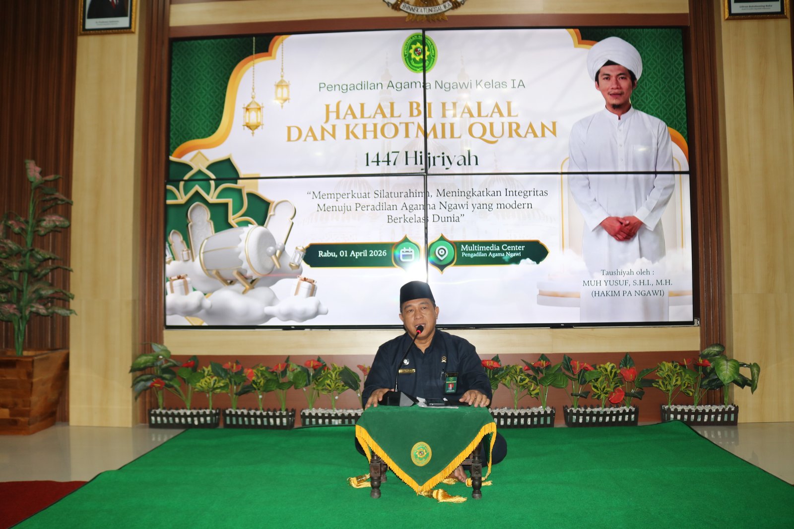 Ngawi, 1 April 2026 — Pengadilan Agama (PA) Ngawi menyelenggarakan kegiatan Halal Bihalal dan Khotmil Qur’an dalam rangka Idul Fitri 1447 Hijriah pada Rabu (1/4/2026). Kegiatan ini dilaksanakan di ruang Multimedia Center PA Ngawi dan dihadiri oleh seluruh pegawai. Acara tersebut menjadi momentum penting untuk mempererat silaturahmi sekaligus meningkatkan integritas aparatur peradilan agama. Dengan suasana penuh kekeluargaan, kegiatan berlangsung tertib dan khidmat dari awal hingga akhir.