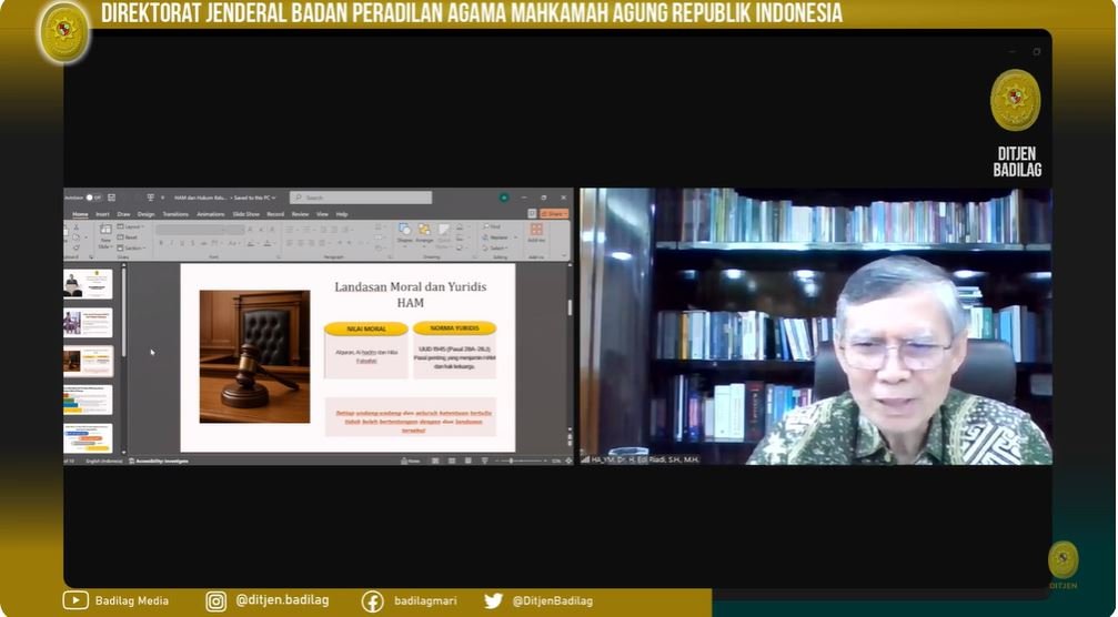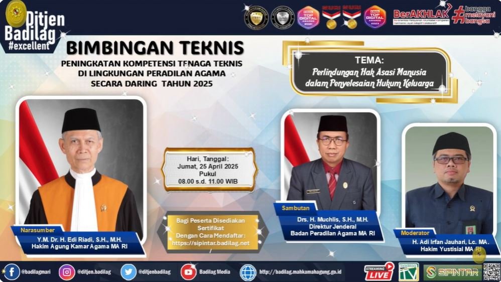 Jumat (25/4) Seluruh Tenaga Teknis Pengadilan Agama Ngawi menghadiri kegiatan bimbingan teknis secara daring. Hal ini berdasarkan surat undangan nomor 847/DJA.DL1.10/IV/2025 tanggal 14 April 2025 tentang pemanggilan peserta bimbingan teknis peningkatan kompetensi tenaga teknis di Lingkungan Peradilan Agama Secara Daring. Kegiatan ini diselenggerakan oleh Direktorat Jenderal Badan Peradilan Agama Mahkamah Agung Republik Indonesia. Bimbingan Teknis dilaksanakan dengan tujuan untuk meningkatkan kualitas dan kapasitas tenaga teknis di lingkungan peradilan agama dalam permasalahan teknis yustisial. Seluruh tenaga teknis Pengadilan Agama Ngawi sangat antusias dalam menyimak bimtek secara daring zoom meeting di ruang Media Center Pengadilan Agama Ngawi Kelas IA. Tema yang diusung pada bimtek kali ini yakni, “Perlindungan Hak Asasi Manusia Dalam Penyelesaian Hukum Keluarga dengan narasumber Yang Mulia Hakim Agung Kamar Agama Mahkamah Agung Republik Indonesia, Bapak Dr. H. Edi Riadi, S.H., M.H.
