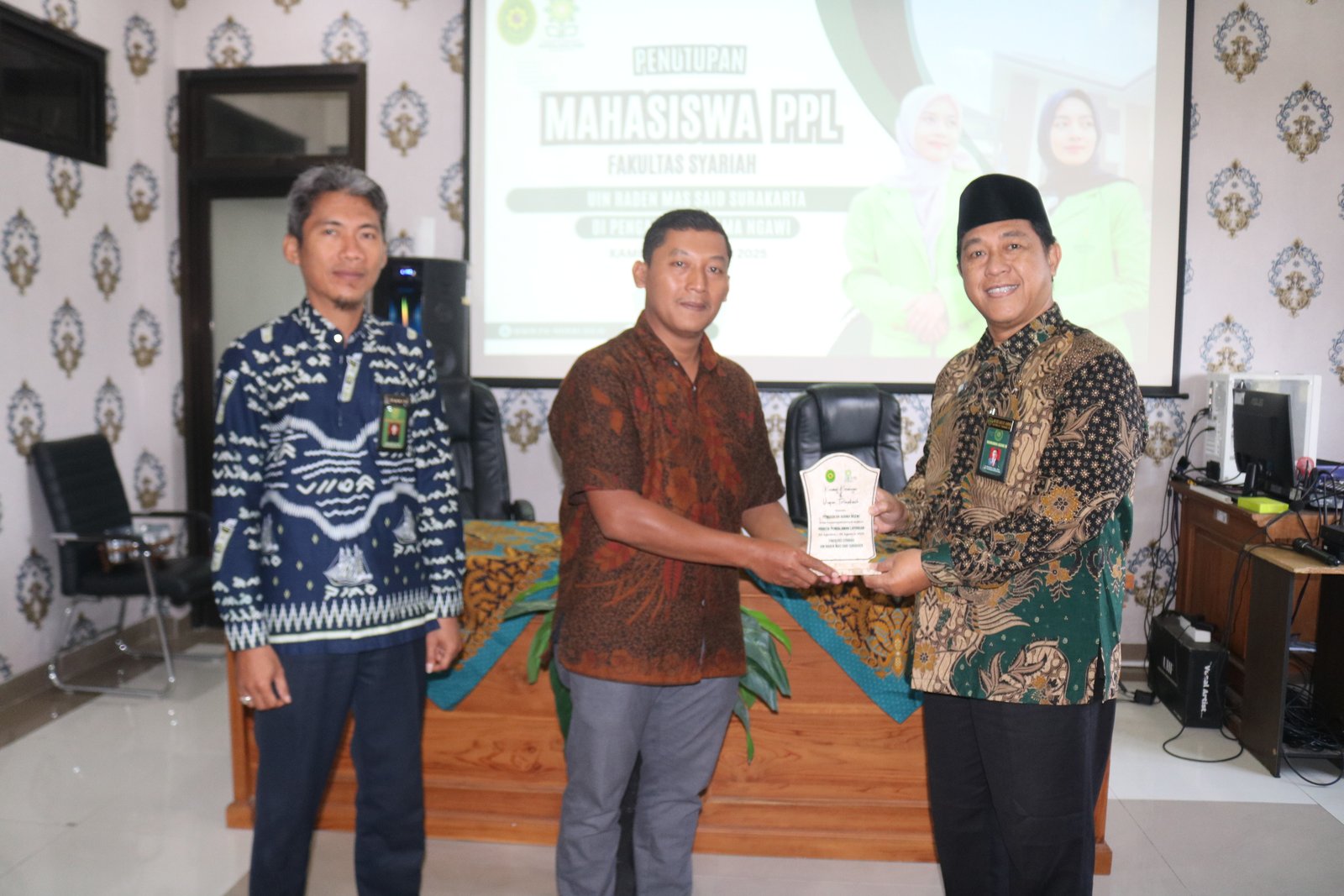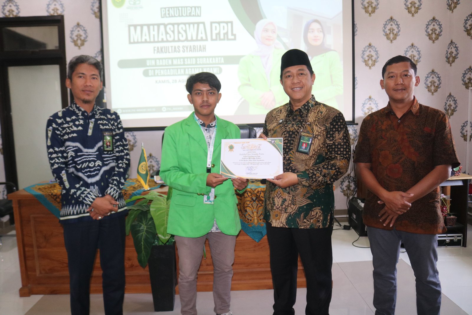 Sementara itu, perwakilan mahasiswa magang Hafidh Ulya mengungkapkan rasa terima kasih atas bimbingan dan kesempatan yang telah diberikan oleh seluruh jajaran Pengadilan Agama Ngawi."Kami mendapatkan banyak ilmu dan wawasan baru selama berada di sini. Terima kasih atas sambutan hangat dan bimbingannya selama kami belajar dan berproses di Pengadilan Agama Ngawi," tuturnya. Adapun pemberian sertifikat magang diberikan oleh Ketua Pengadilan Agama Ngawi secara simbolis. Serta pemberian vandel dari mahasiswa UIN Raden Mas Said sebagai wujud kenangan atas kesempatan yang telah diberikan kepada mereka. Acara ditutup dengan doa dan sesi foto bersama Dengan berakhirnya kegiatan ini, diharapkan hubungan baik antara UIN Raden Mas Said Surakarta dan Pengadilan Agama Ngawi dapat terus terjalin melalui program magang, penelitian, maupun kerja sama lainnya demi kemajuan dunia pendidikan dan praktik hukum di Indonesia. (ambr)