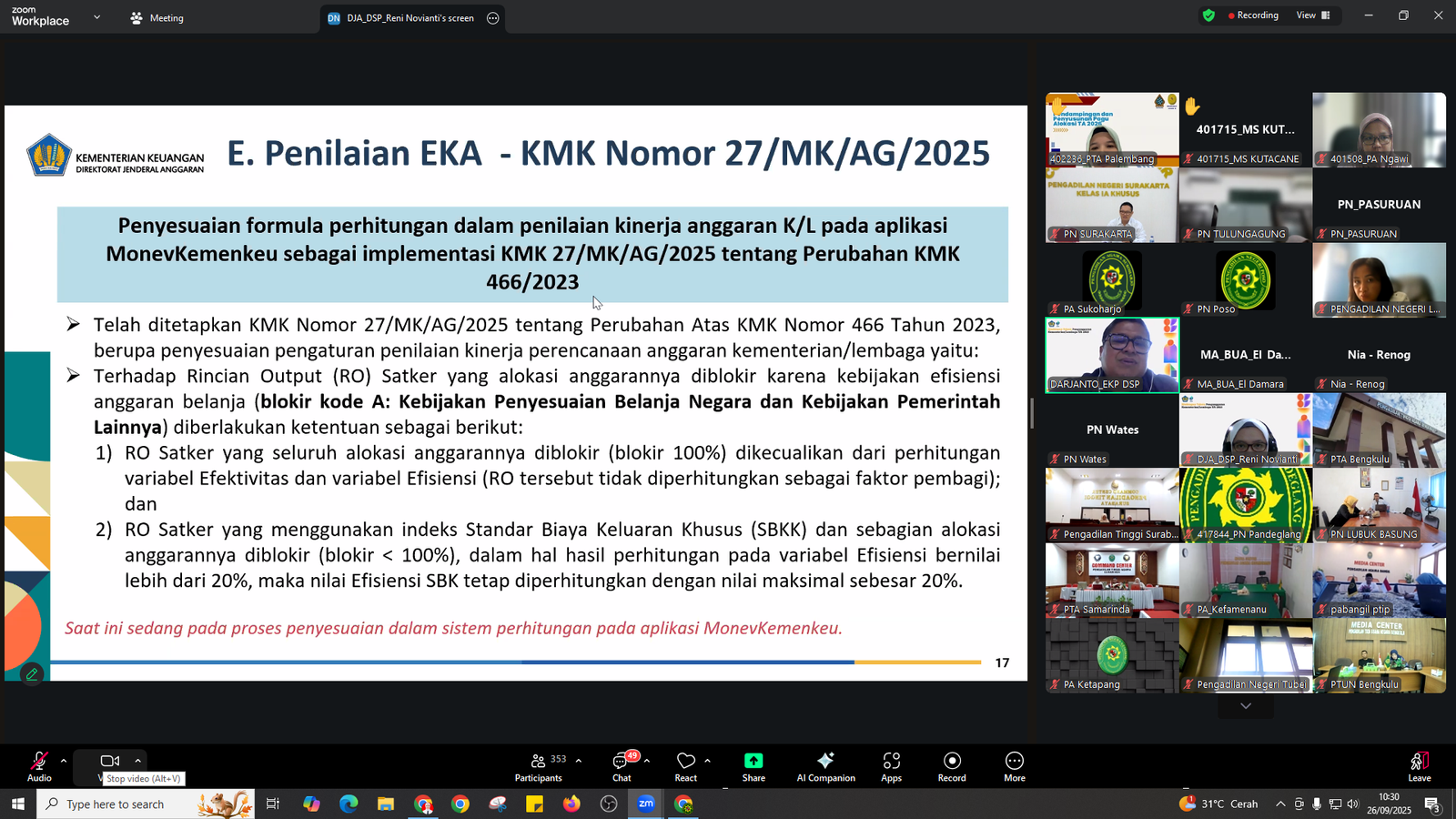 Ngawi – Satuan kerja Pengadilan Agama (PA) Ngawi turut serta dalam kegiatan Monitoring dan Evaluasi Pelaporan Data Nilai Kinerja Perencanaan Anggaran Triwulan III Tahun Anggaran 2025 yang diselenggarakan oleh Badan Urusan Administrasi (BUA) Mahkamah Agung RI. Kegiatan ini berlangsung secara daring pada Kamis–Jumat, 25–26 September 2025 melalui aplikasi Zoom Meeting, dengan narasumber dari Direktorat Sistem Penganggaran, Kementerian Keuangan RI. Kehadiran PA Ngawi pada acara ini diwakili oleh Pengolah Data dan Informasi, yang mewakili Sekretaris Pengadilan Agama Ngawi.