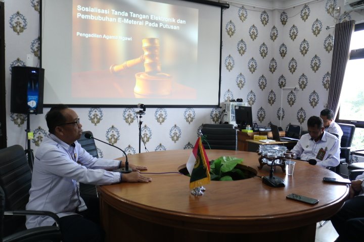 Ngawi, 05 Januari 2026 – Pengadilan Agama Ngawi menggelar kegiatan sosialisasi tanda tangan elektronik (digital signature) dan pembubuhan e-materai pada putusan pada Senin (05/01/26). Kegiatan tersebut dilaksanakan di Ruang Media Center Pengadilan Agama Ngawi dan dipimpin langsung oleh Ketua Pengadilan Agama Ngawi, A. Mahfudin, S.Ag., M.H., beserta Wakil Ketua, Ahsan Dawi, S.H., S.H.I., M.S.I..