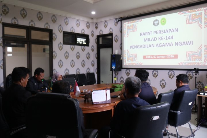 Ngawi – Rabu, 07 Januari 2026, Pengadilan Agama Ngawi menggelar rapat persiapan Milad ke-144 Pengadilan Agama Ngawi yang akan diperingati pada 19 Januari 2026. Rapat berlangsung di Ruang Media Center Pengadilan Agama Ngawi dan dilaksanakan sebagai upaya untuk mematangkan seluruh rangkaian kegiatan yang telah direncanakan. Rapat persiapan tersebut dipimpin langsung oleh Ketua Pengadilan Agama Ngawi, A. Mahfudin, S.Ag., M.H., serta dihadiri oleh Ketua Panitia Milad ke-144, Sapuan, S.H.I., M.H., dan para Koordinator masing-masing seksi kepanitiaan, yaitu Seksi Acara, Seksi Perlengkapan, Seksi Protokoler, Seksi Konsumsi, Seksi Transportasi dan Keamanan, serta Seksi Dokumentasi dan Publikasi.
