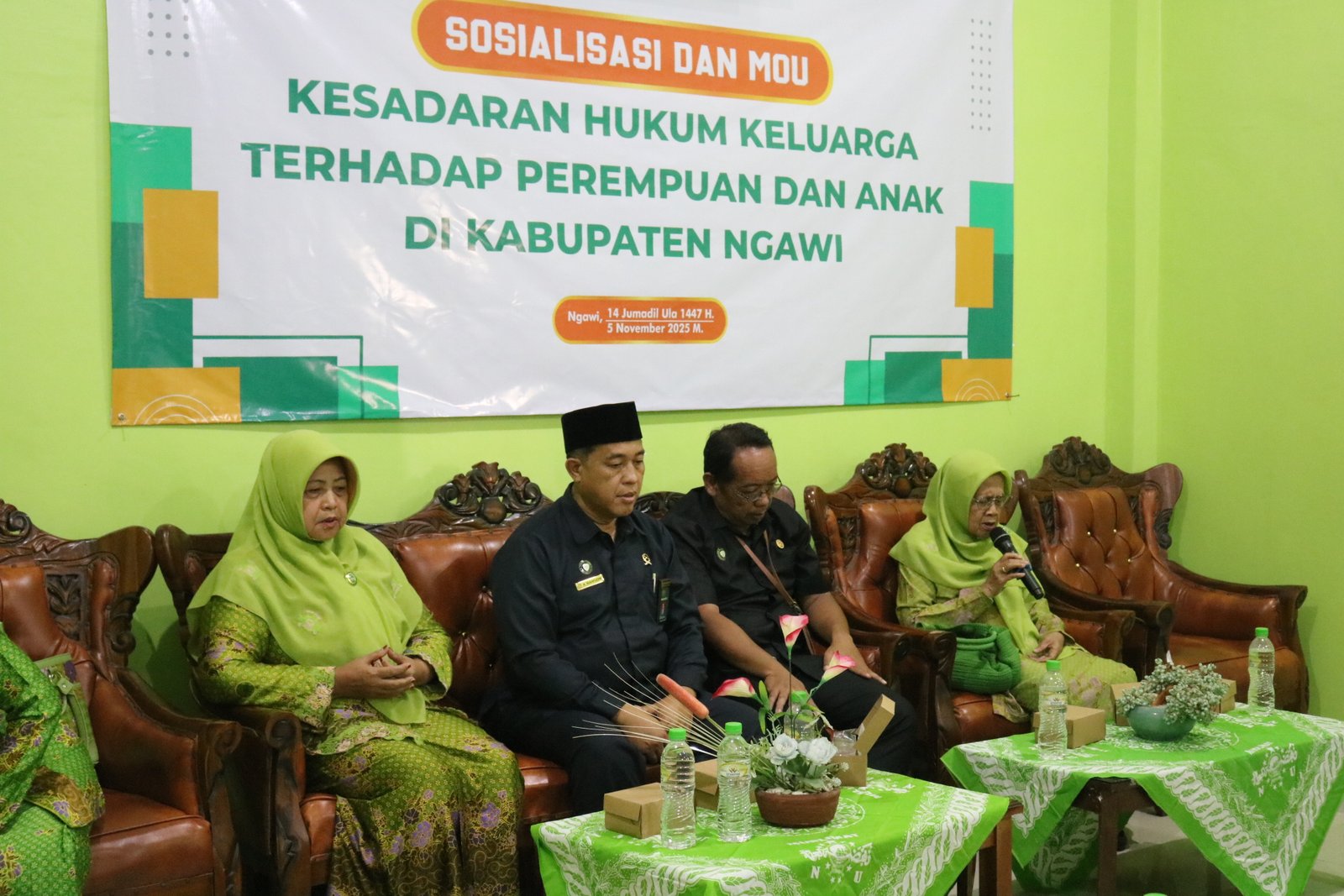 Dalam sambutannya, Ketua Pengadilan Agama Ngawi, A. Mahfudin, S.Ag., M.H., menyampaikan bahwa kerja sama ini merupakan langkah strategis dalam memperkuat peran Pengadilan Agama sebagai lembaga peradilan yang tidak hanya berfungsi menyelesaikan perkara, tetapi juga berperan aktif dalam edukasi dan sosialisasi hukum keluarga kepada masyarakat. Kami merasa terhormat dapat bekerja sama dengan Pengadilan Agama Ngawi. MoU ini menjadi awal bagi langkah nyata Muslimat NU dalam meningkatkan kesadaran hukum di kalangan ibu-ibu dan keluarga agar semakin memahami pentingnya keadilan, keseimbangan, dan keharmonisan dalam rumah tangga,” tutur beliau.