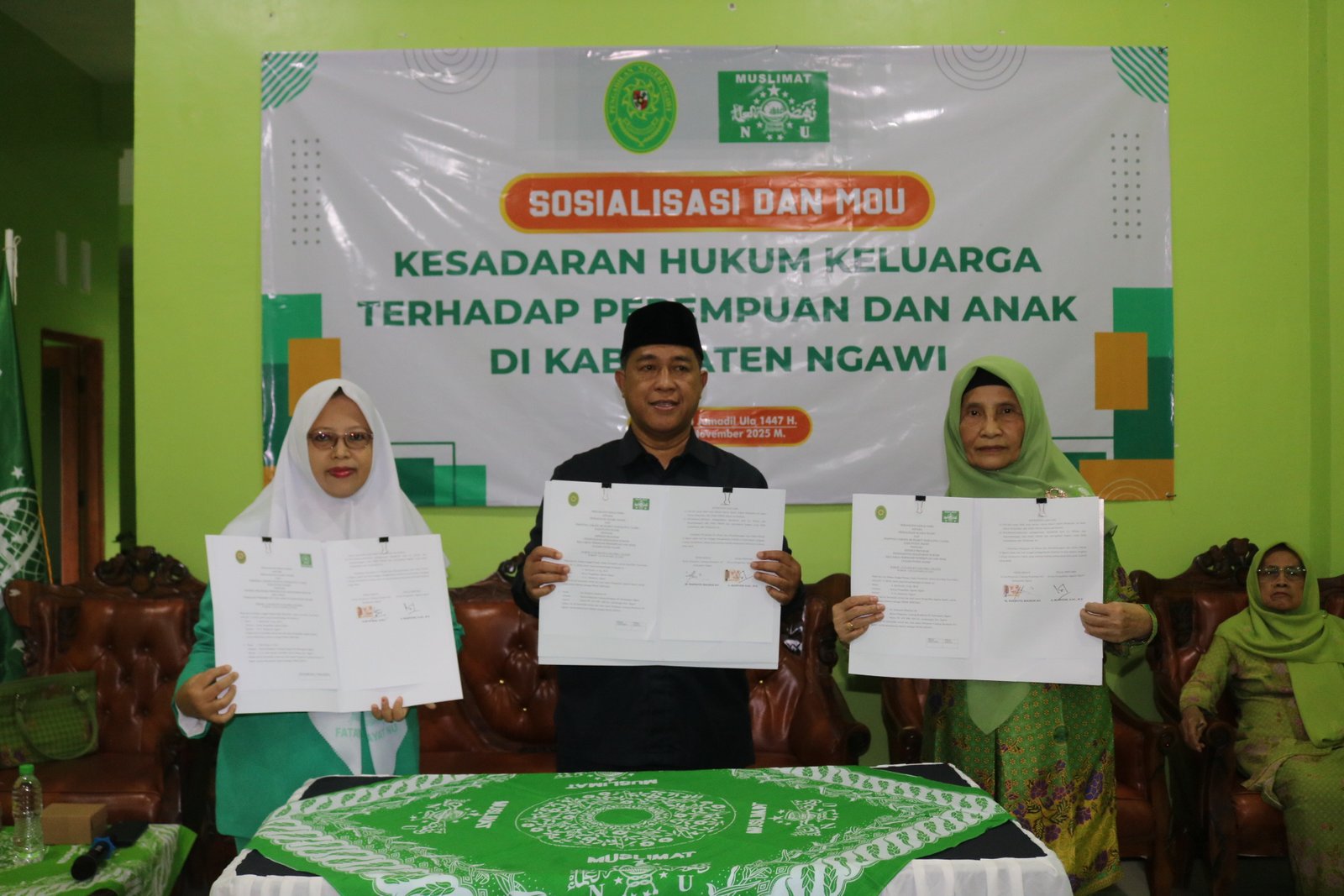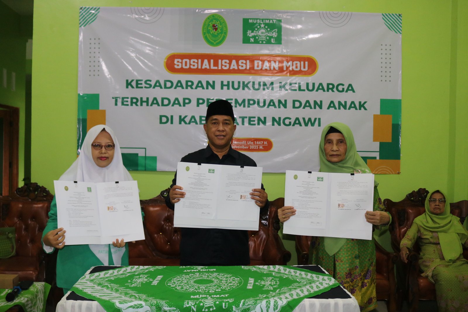 Ngawi – Sebagai wujud komitmen dalam memperkuat kesadaran hukum masyarakat, khususnya di kalangan perempuan dan keluarga muda, Pengadilan Agama Ngawi Kelas I A bersama Pimpinan Cabang Fatayat Nahdlatul Ulama (NU) Kabupaten Ngawi melaksanakan kegiatan penandatanganan Memorandum of Understanding (MoU) tentang kerja sama dalam bidang peningkatan kesadaran hukum keluarga, perlindungan perempuan dan anak, pada Selasa (04/11/2025). Acara tersebut diselenggarakan di Kantor Muslimat NU Kabupaten Ngawi dan dihadiri oleh jajaran pimpinan serta anggota dari kedua lembaga. MoU ini ditandatangani langsung oleh Ketua Pengadilan Agama Ngawi, A. Mahfudin, S.Ag., M.H., dan Ketua Pimpinan Cabang Fatayat NU Kabupaten Ngawi, Ulin Ni’mah, S.Pd.I.