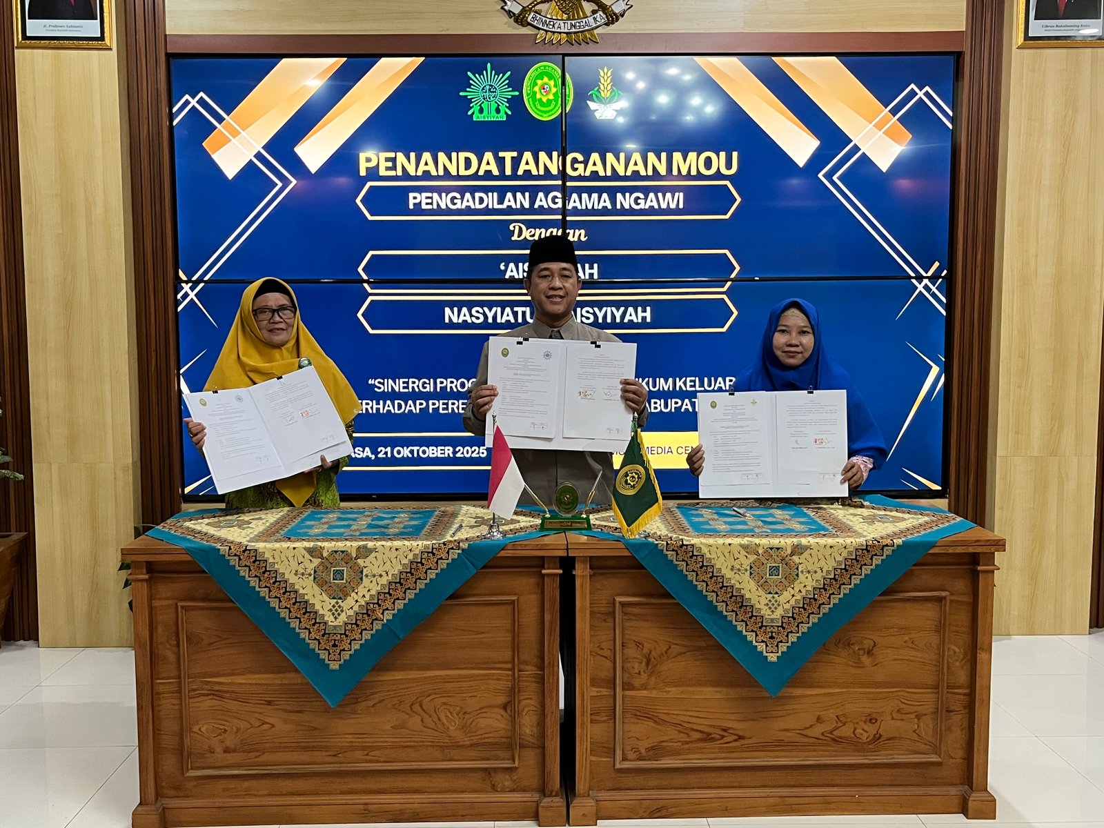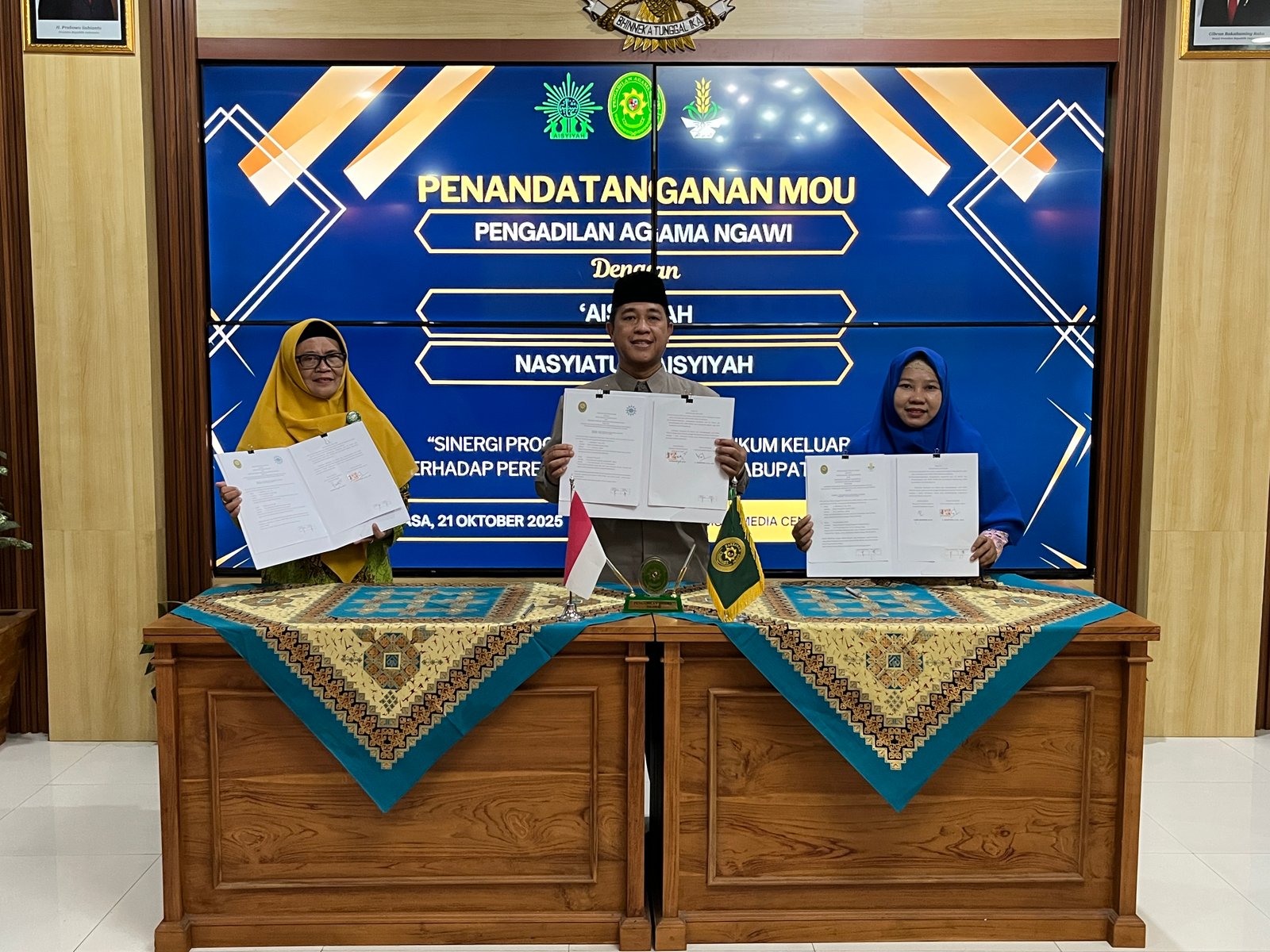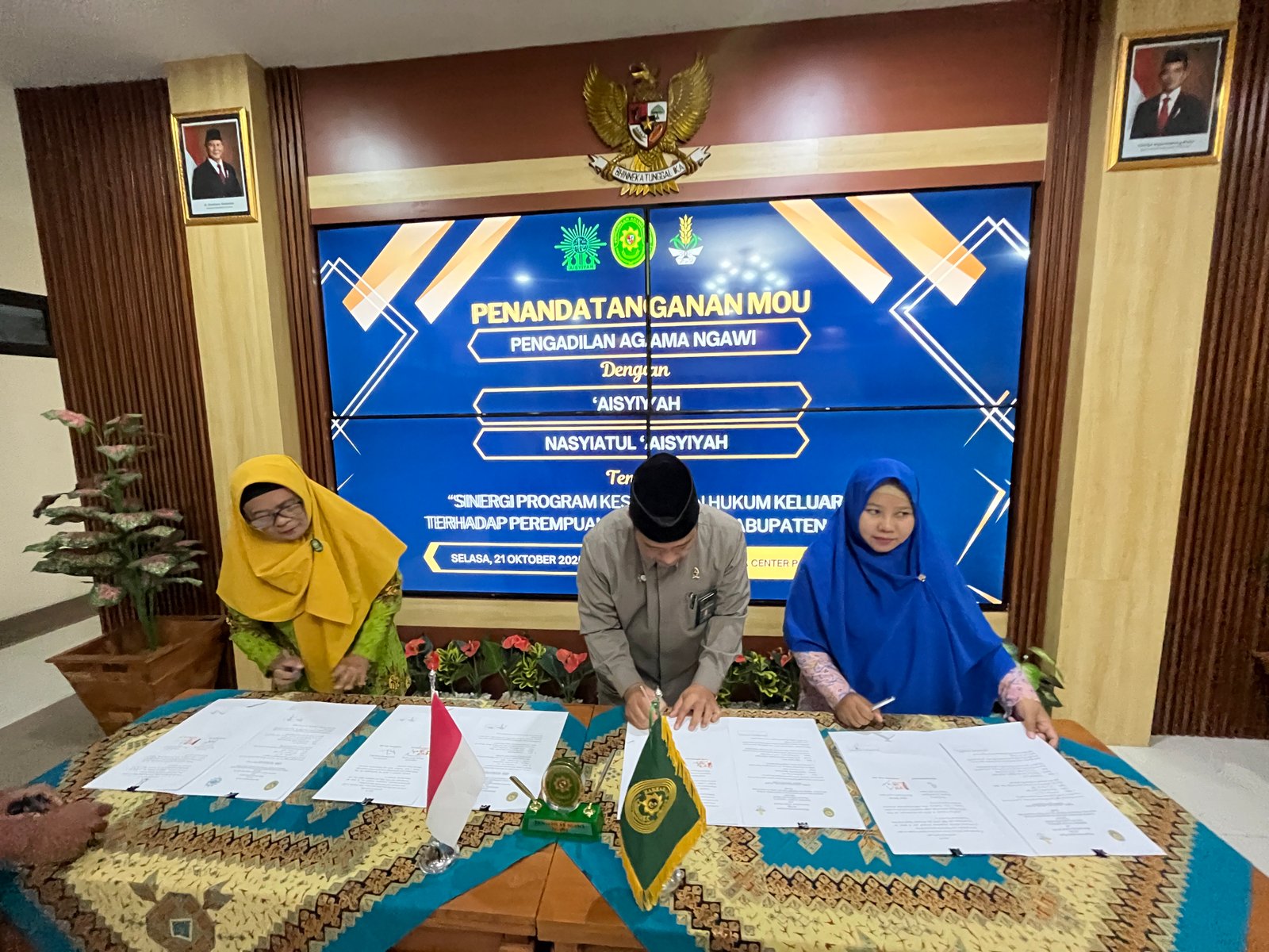 Ngawi, 21 Oktober 2025 – Pagi ini (21/10), Pengadilan Agama Ngawi resmi menandatangani Nota Kesepahaman (MoU) dengan Pimpinan Daerah 'Aisyiyah Kabupaten Ngawi. Penandatanganan MoU dalam rangka memperkuat sinergi program kesadaran hukum keluarga, khususnya yang berkaitan dengan perempuan dan anak. Penandatanganan MoU ini dilaksanakan pada pukul 10.00 WIB di Ruang Multimedia Center Pengadilan Agama Ngawi. ‘Aisyiyah merupakan organisasi perempuan Islam sebagai organisasi otonom dari Muhammadiyah.