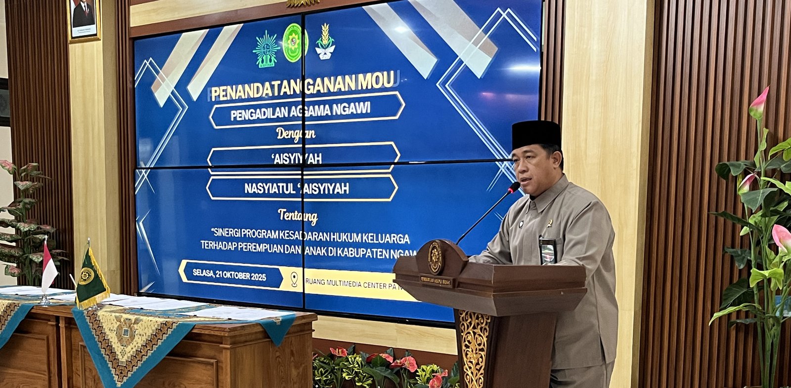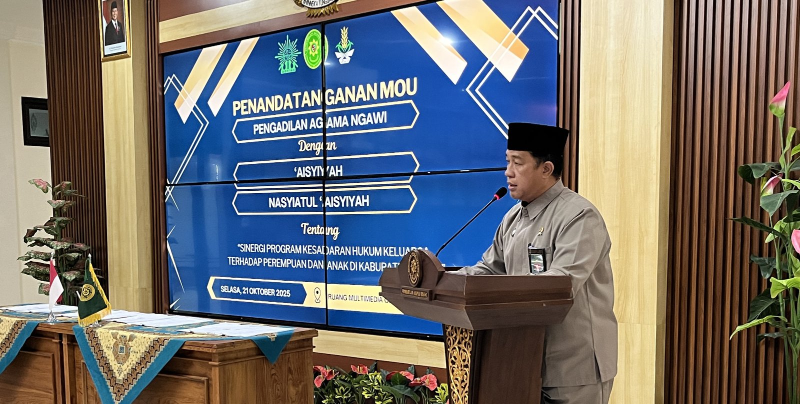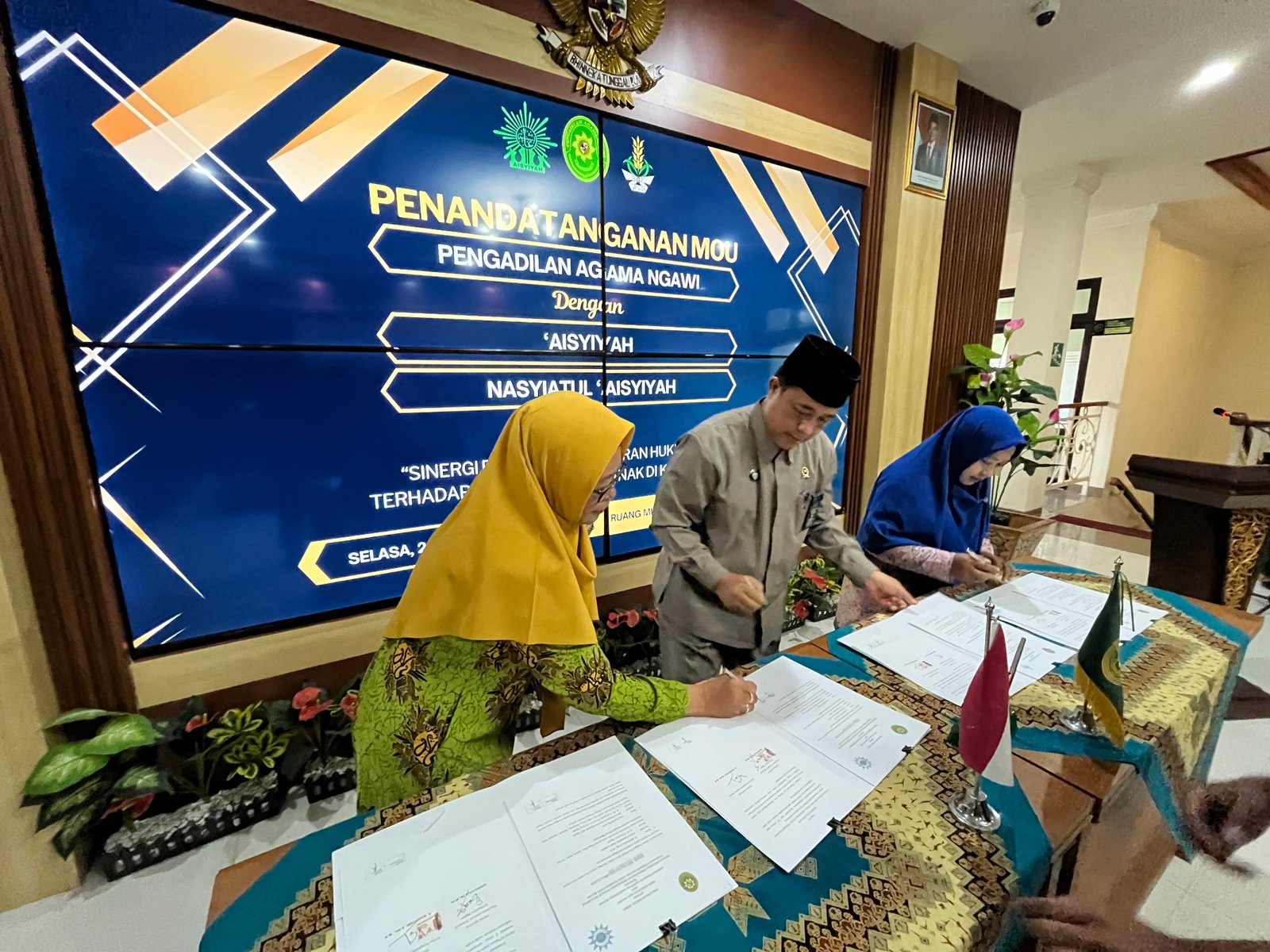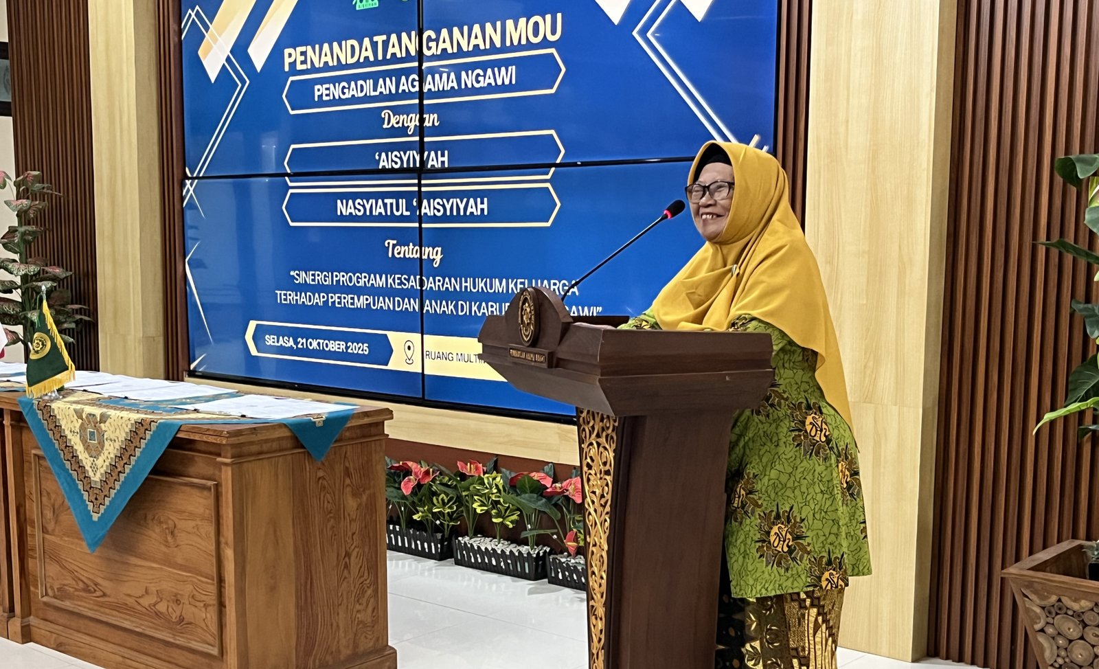 Ngawi, 21 Oktober 2025 – Pagi ini (21/10), Pengadilan Agama Ngawi resmi menandatangani Nota Kesepahaman (MoU) dengan Pimpinan Daerah 'Aisyiyah Kabupaten Ngawi. Penandatanganan MoU dalam rangka memperkuat sinergi program kesadaran hukum keluarga, khususnya yang berkaitan dengan perempuan dan anak. Penandatanganan MoU ini dilaksanakan pada pukul 10.00 WIB di Ruang Multimedia Center Pengadilan Agama Ngawi. ‘Aisyiyah merupakan organisasi perempuan Islam sebagai organisasi otonom dari Muhammadiyah.