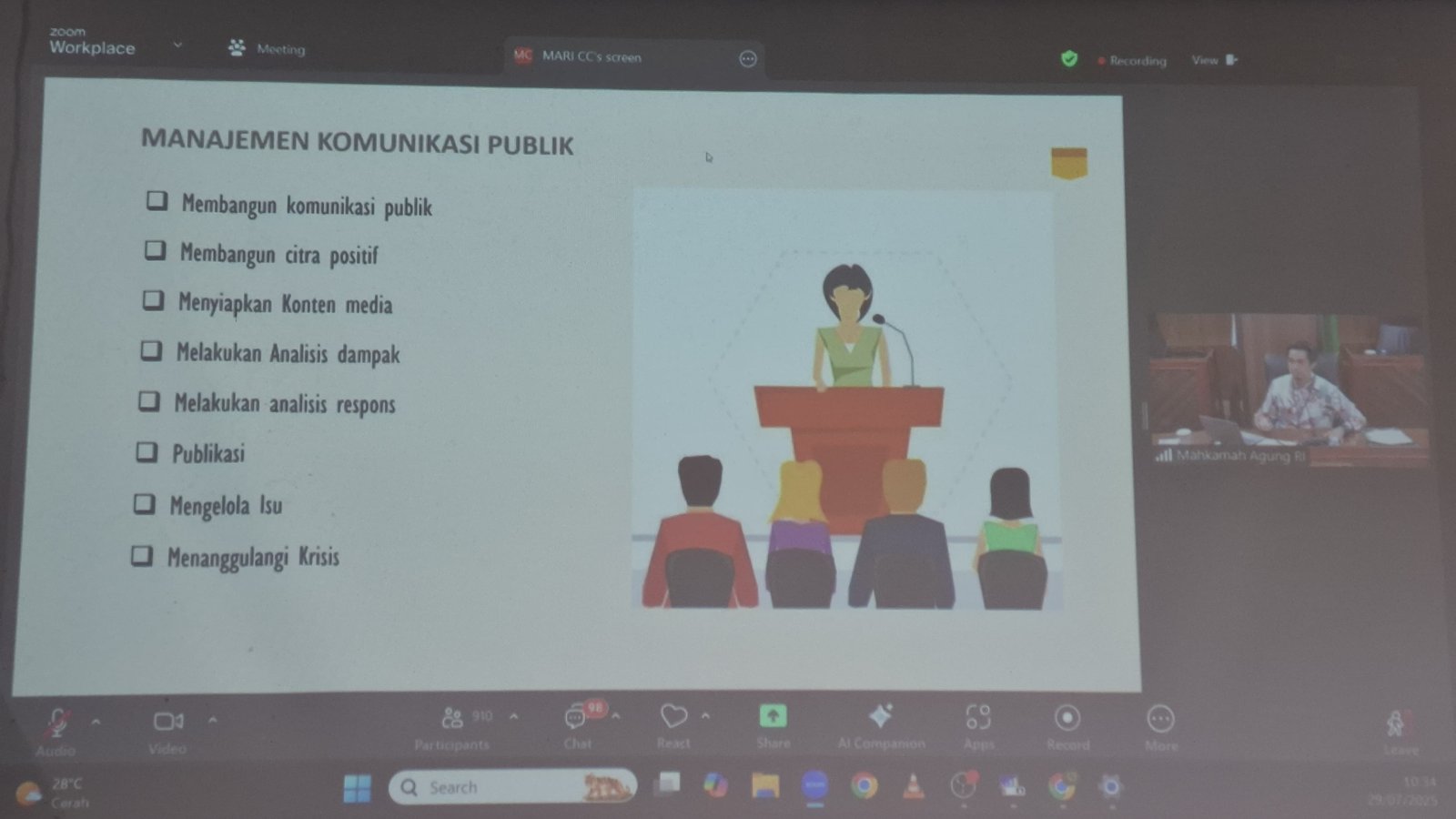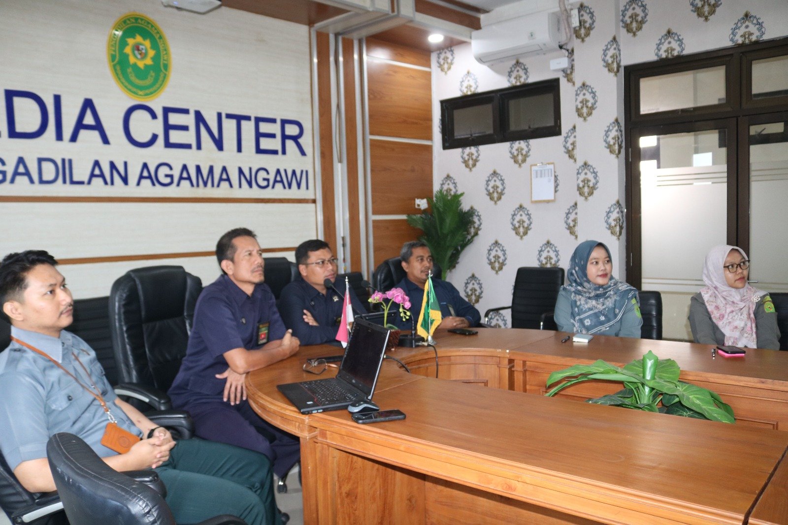 Ngawi, 29 Juli 2025 – Dalam rangka meningkatkan kemampuan komunikasi publik dan memperkuat citra positif lembaga peradilan di mata masyarakat, Badan Urusan Administrasi MA RI menyelenggarakan kegiatan Pelatihan Juru Bicara dan Pengelolaan Media Sosial di 4 Lingkungan Peradilan secara zoom. Kegiatan ini diikuti oleh perwakilan dari berbagai satuan kerja peradilan di bawah Mahkamah Agung Republik Indonesia. Berdasarkan undangan nomor 145/BUA.6/UND.HM2.1/VII/2025 tanggal 23 Juli 2025, perwakilan dari PA Ngawi yang turut hadir yakni Hakim Sapuan, S.H.I., M.H. yang selaku humas PA Ngawi, Panitera Tamaji, S.Ag., M.H. Panmud Permohonan Mokhamad Imron, S.H. Kasubag PTIP Agus Widyanto, S.H.I dan dihadiri pula oleh tim media Muhammad Ismail Hasan, S.Kom Dwi Ambar Alfiyah, A.Md.S.I., dan Riofitri Susanti, A.Md. Kegiatan dimulai pukul 09.00 WIB secara zoom di ruang Media Center Pengadilan Agama Ngawi Kelas IA.