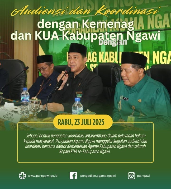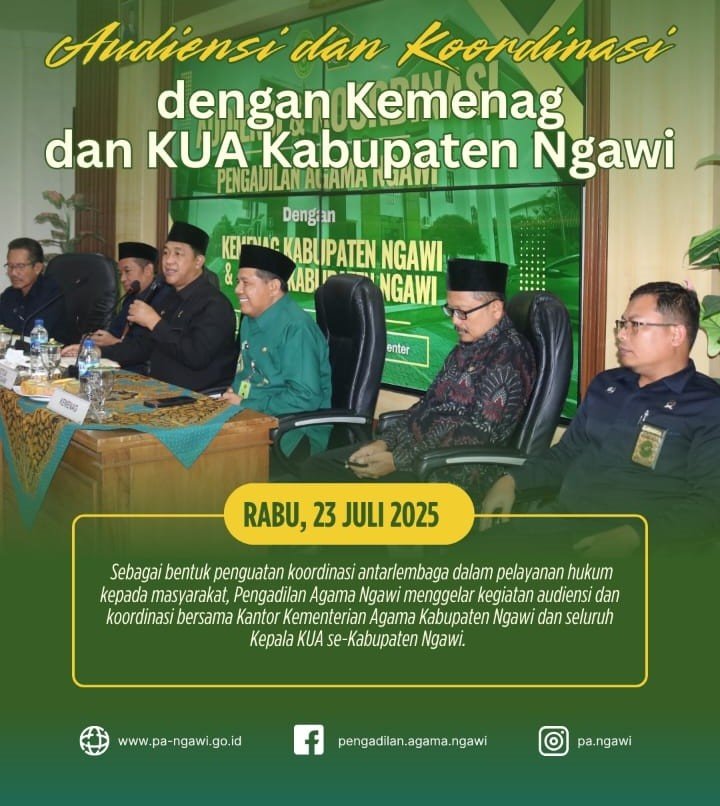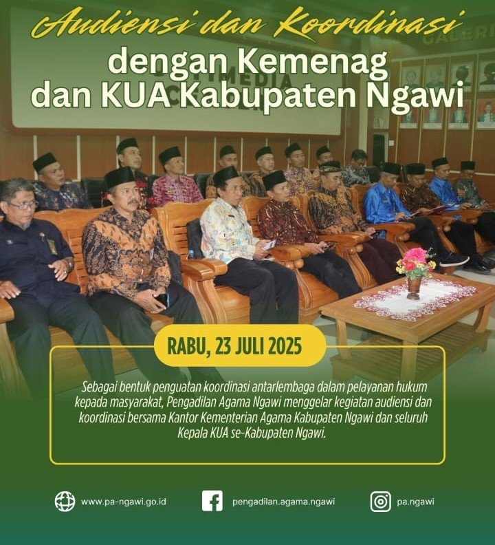 Ngawi, 23 Juli 2025 - Sebagai bentuk penguatan koordinasi antarlembaga dalam pelayanan hukum kepada masyarakat, Pengadilan Agama Ngawi menggelar kegiatan audiensi dan koordinasi bersama Kantor Kementerian Agama Kabupaten Ngawi dan seluruh Kepala KUA se-Kabupaten Ngawi. Acara ini berlangsung di Ruang Multimedia Center Pengadilan Agama Ngawi, Rabu (23/7), dan menjadi ruang dialog strategis dalam menyikapi kebijakan terbaru terkait administrasi pernikahan.